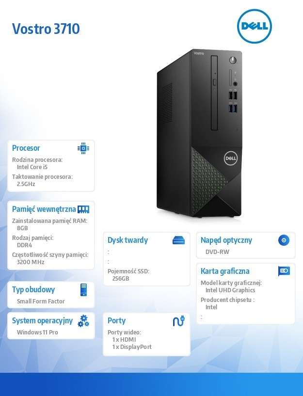 - Dell Komputer Vostro 3710 SFF Win11Pro i5-12400/8GB/256GB SSD/Intel UHD 730/DVD RW/Kb/Mouse/3YPS